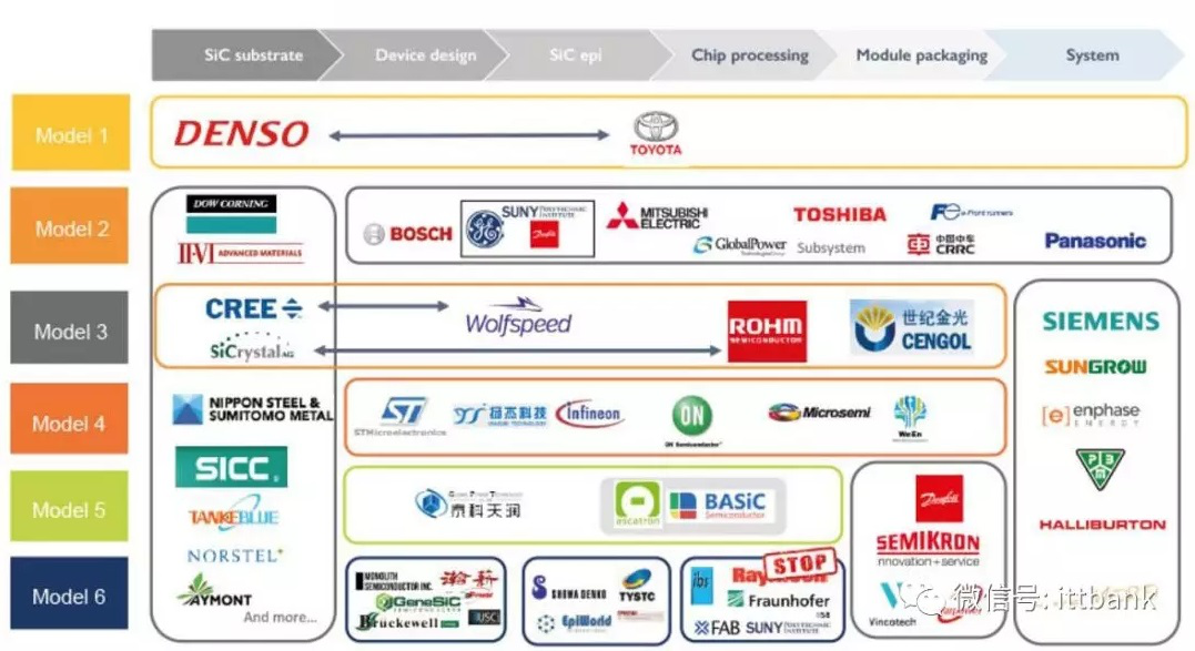 由于碳化硅產(chǎn)業(yè)環(huán)節如芯片性能與材料、結構設計、制造工藝之間的關(guān)聯(lián)性較強,不少企業(yè)仍選擇采用IDM模式,如羅姆和Cree均覆蓋了碳化硅襯底、外延片、器件、模組全產(chǎn)業(yè)鏈環(huán)節,其中Cree占據襯底市場(chǎng)約40%份額、器件市場(chǎng)約23%份額。